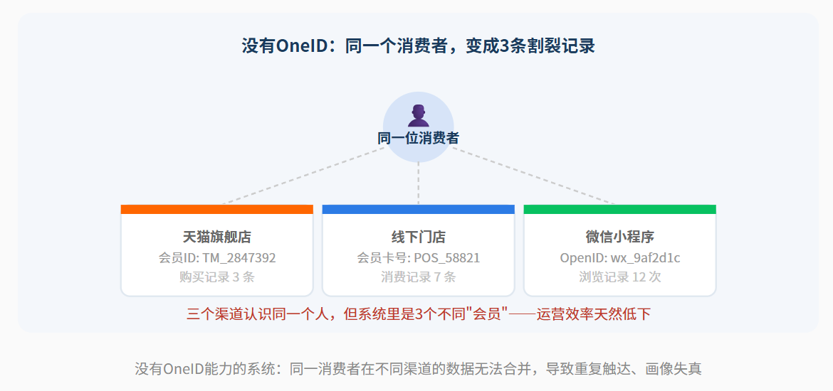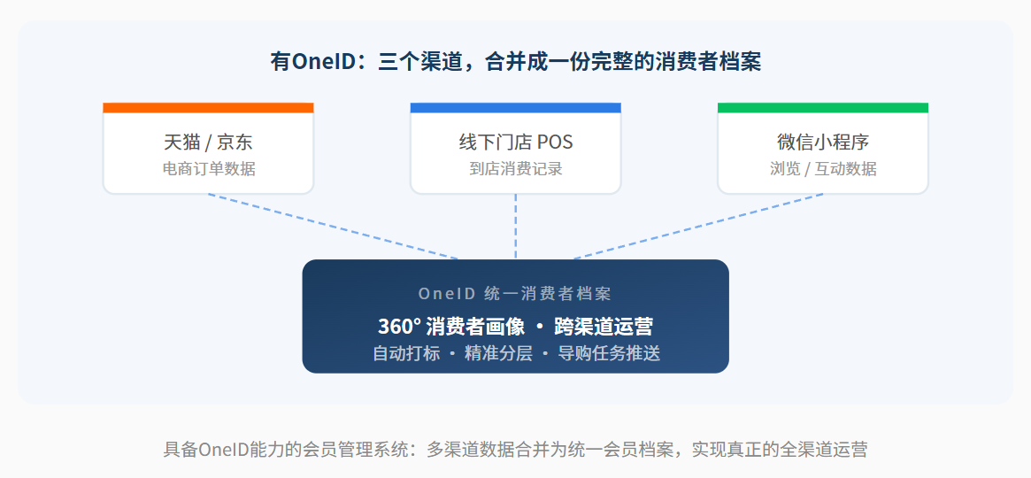 A:OneID是将同一消费者在不同渠道(门店、天猫、微信小程序、抖音等)的身份记录,通过手机号等标识符关联合并,形成唯一的消费者档案。没有OneID能力,同一个人在三个渠道就是三条独立记录——会员画像失真、触达重复、分析失准。这是会员管理系统底层数据架构最核心的能力差距,也是功能列表里最容易被忽视的维度。