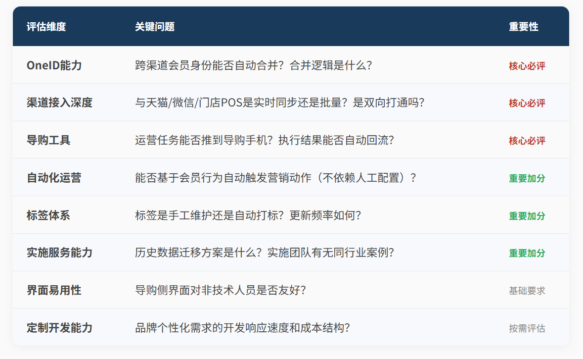 评估要点:在做系统演示时,重点问一个问题——"如果同一个消费者,分别在天猫下单、在门店刷卡、在小程序注册,三条记录是怎么合并成一个会员档案的?用什么逻辑做关联?"如果对方的回答含糊,或者说"需要人工维护",这个系统的OneID能力是有问题的。
