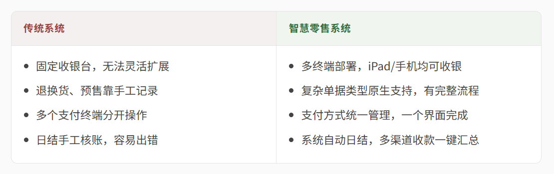 有一个区别值得单独强调:传统系统的报表功能是"存在的",但数据的完整性和实时性往往有缺口——系统里查到的库存数量不可信、销售明细和实际流水对不上、多门店数据需要手工汇总。这些问题在日常运营中会持续消耗大量人工核对时间,但很多品牌已经习惯了,觉得"系统就是这样"。换了智慧零售系统之后,通常第一个感受就是"数对了"。