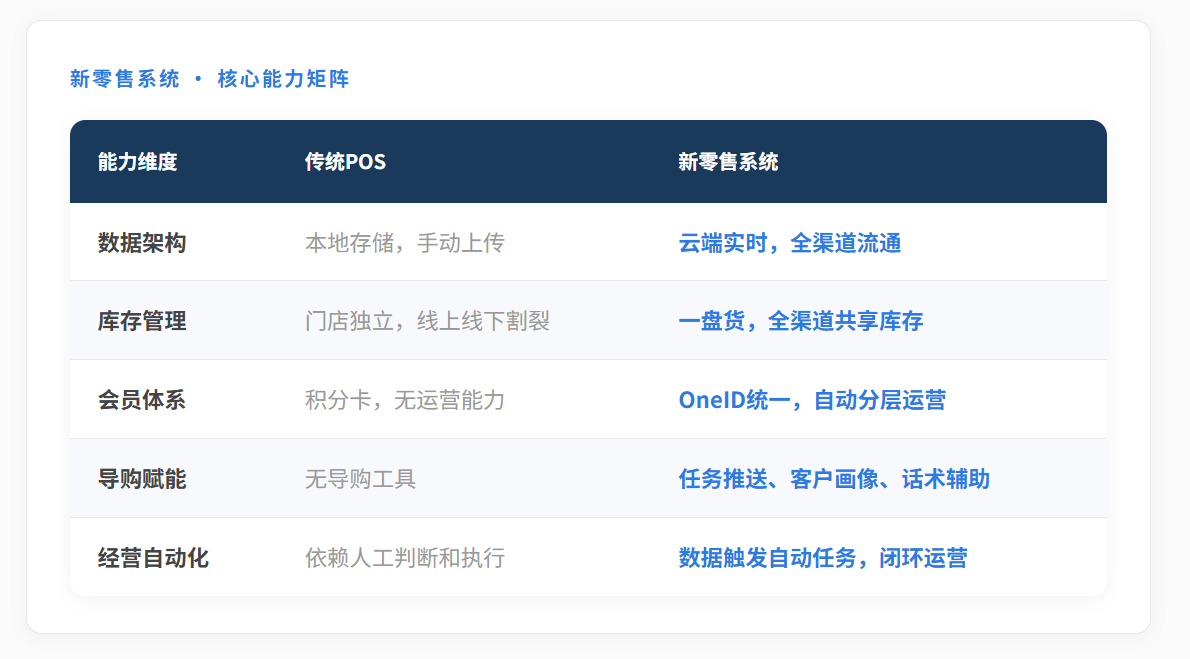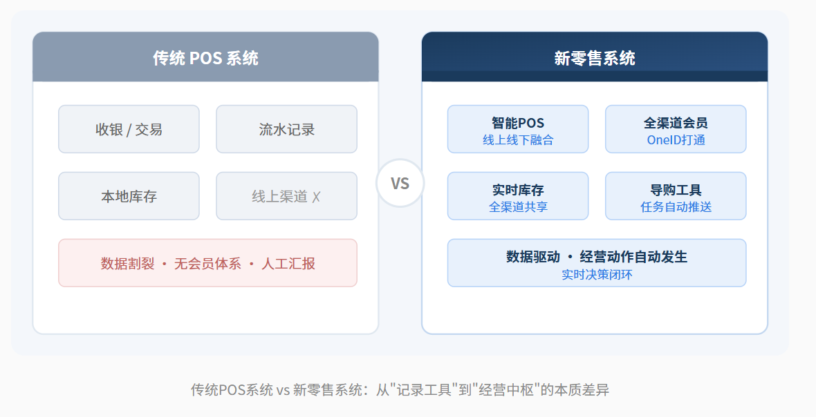 注意这里的关键词:整合、统一、自动发生。这三个词区分了新零售系统和传统POS系统的本质——传统POS完成的是"记录",新零售系统追求的是"驱动"。
