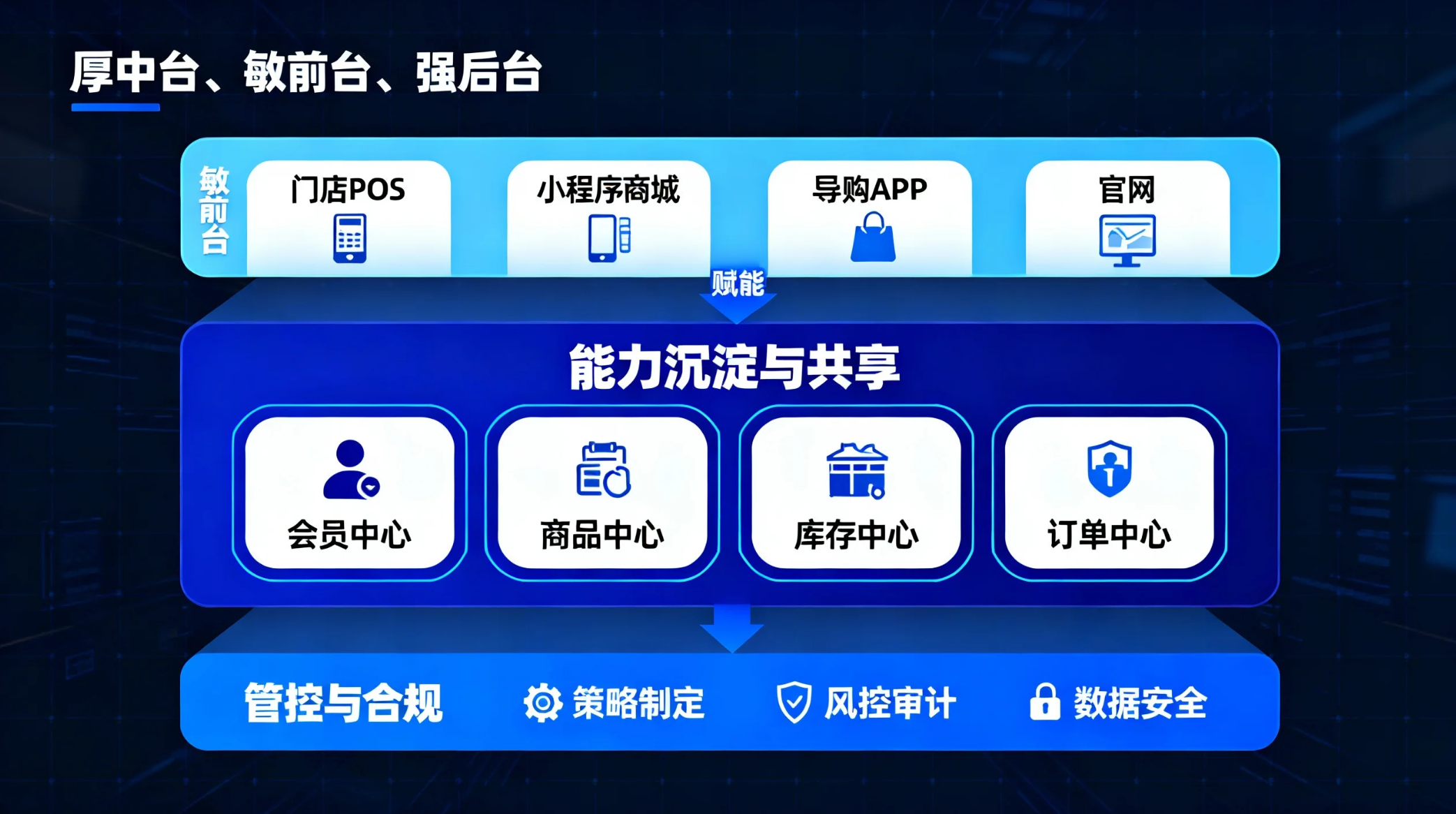 在与众多美妆、服饰连锁品牌的合作实践中发现,一个面向未来的连锁数字化基座,通常遵循“厚中台、敏前台、强后台”的框架: